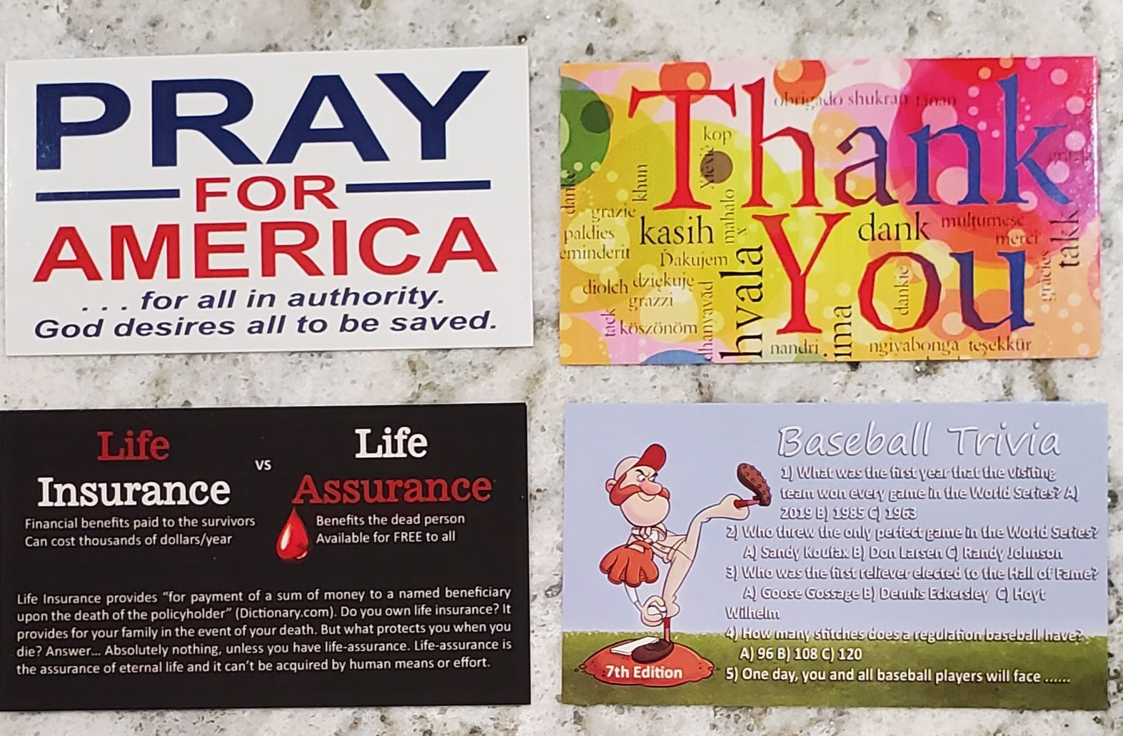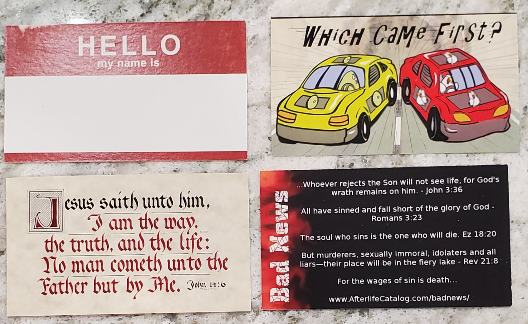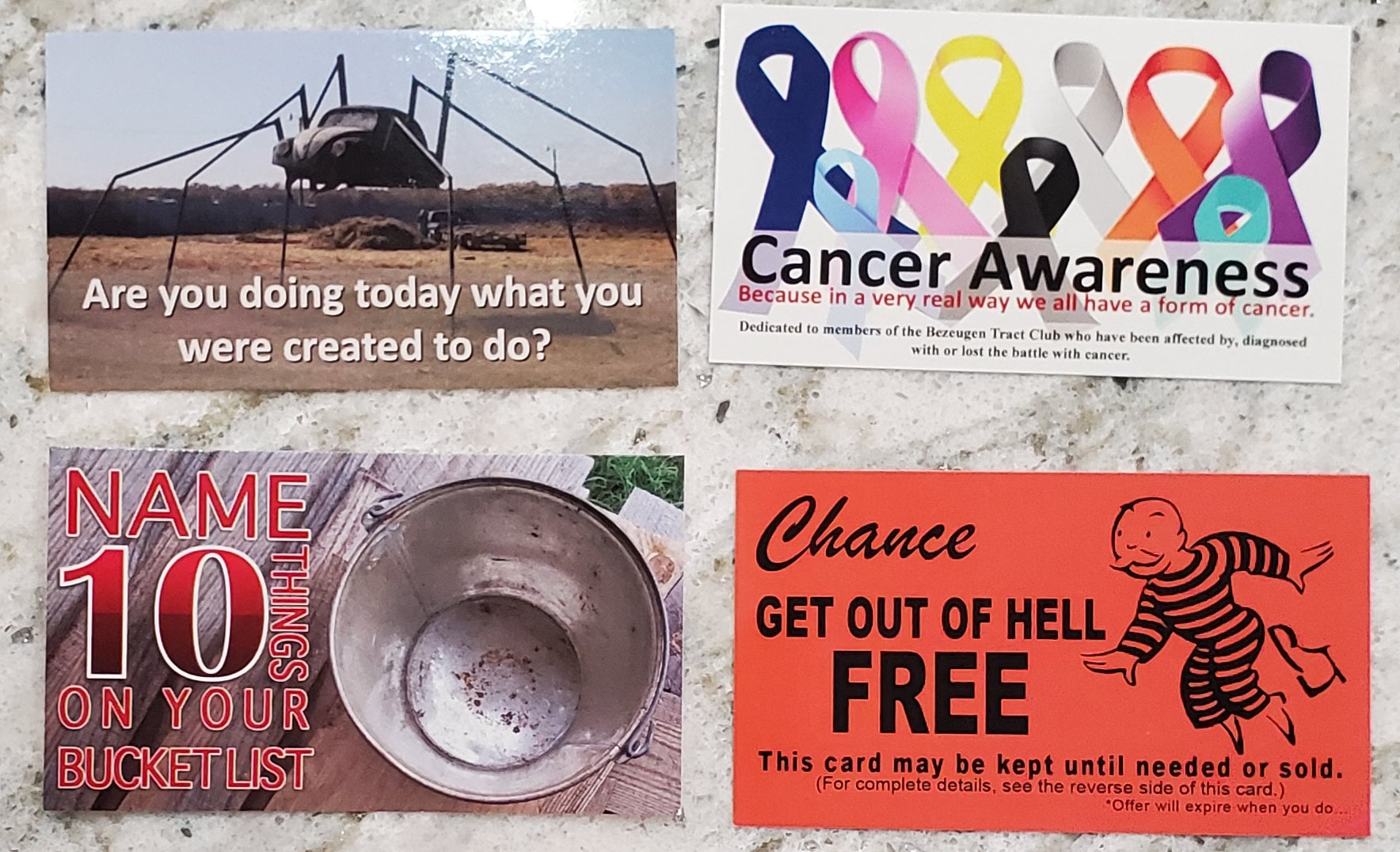 Business card sized tracts fit nicely in your pocket. These are the same tracts distributed via the Bezeugen Tract Club. If 30 tracts per month is not enough, you can request more by donation. Please email btc at bezeugen dot org to indicate the designs that you prefer. Requests are filled based on tracts on hand. images represent a selection of the tracts we have available and may not represent all tracts or imply that we have those pictured. Donations are deductible to the limits allowed by US Law. When you checkout, please specify the tracts you'd like in the "